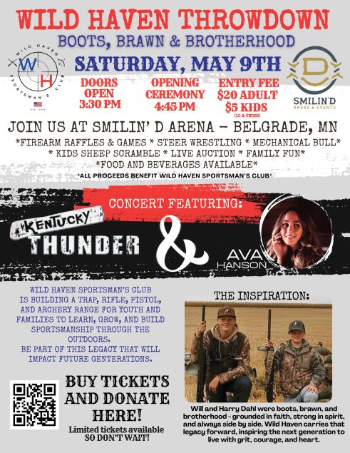 There will be firearm raffles & games, steer westling, mechanical bull, Kids Sheep Scramble, Live auction, family fun, concert, and food and beverages available. All prceeds benefit Wild Haven Sportsman’s Club.