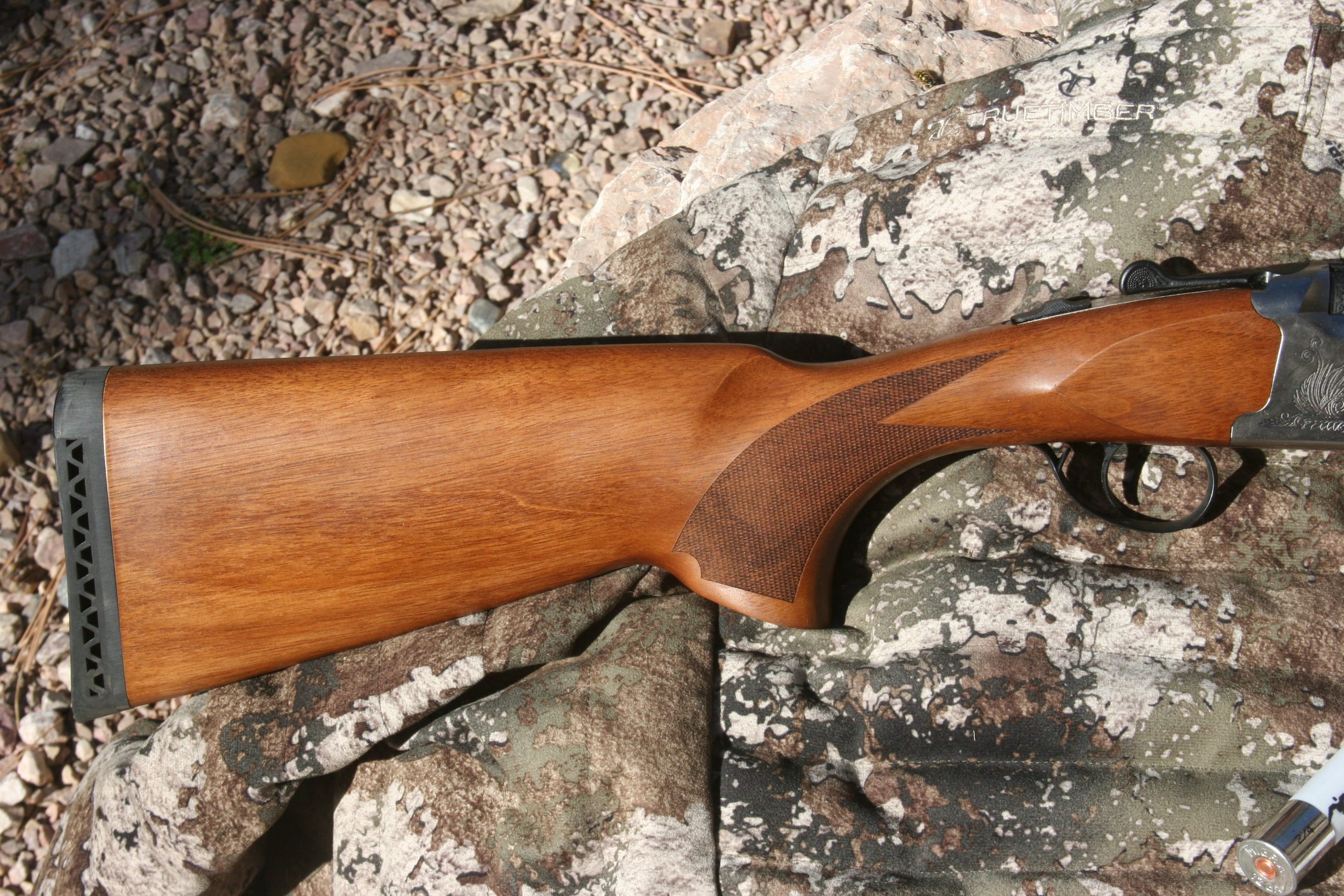 Most smooth-bore models offered by this company are designed for hard field applications: for waterfowl or swamp hogs, for example. The stack barrel reviewed here is built with a box lock receiver design, standard selector (barrel) tang safety, and a 7075 aluminum receiver. Wood stock quality is good by way of a straight-grain, Turkish walnut with metal-to-wood edges that’s tight and clean.