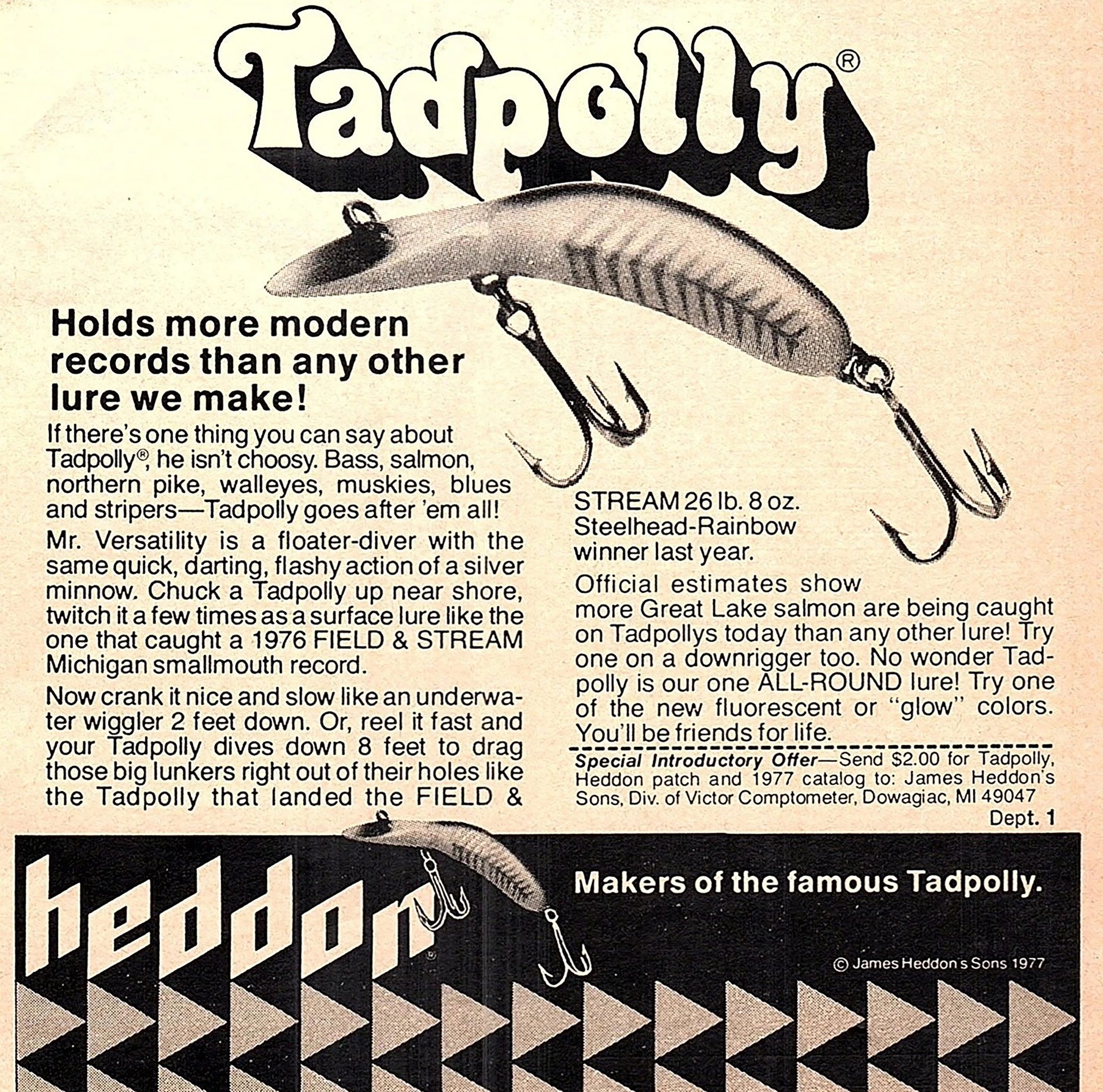 By 1972, a smoother-body mold was back in use, the standard size Tadpolly was now rated as 1/2-ounce class, and all sizes of Tadpolly, along with several other Heddon models, had adopted the brass plate hook hangers that would stay until the end of production. It is believed in some quarters that this change was engineered to pacify anglers who were complaining of losing hard-fighting fish when the screw eye carrying the hook was pulled out of the body of the lure. We don’t know for sure if this is true, but considering the Tadpolly’s popularity with salmon anglers, it seems quite possible.