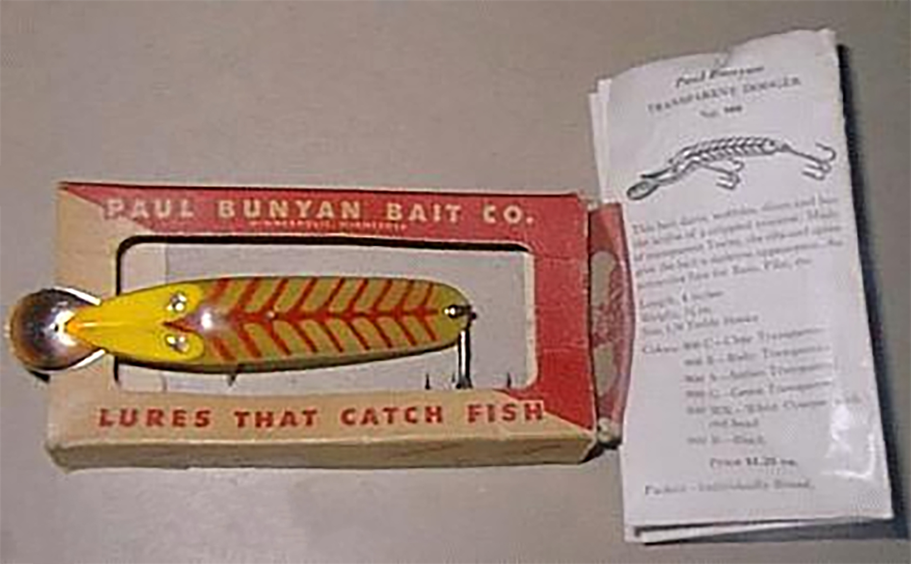 The Paul Bunyan Bait Company originated in 1939 in Minneapolis, Minn. They were a very popular fishing lure manufacturer and distributor through the 1960s, creating a large range of fishing lures and products. A lot of these baits are still in use today, and many are in collectors’ displays. One of the more famous ones is the Dodger.