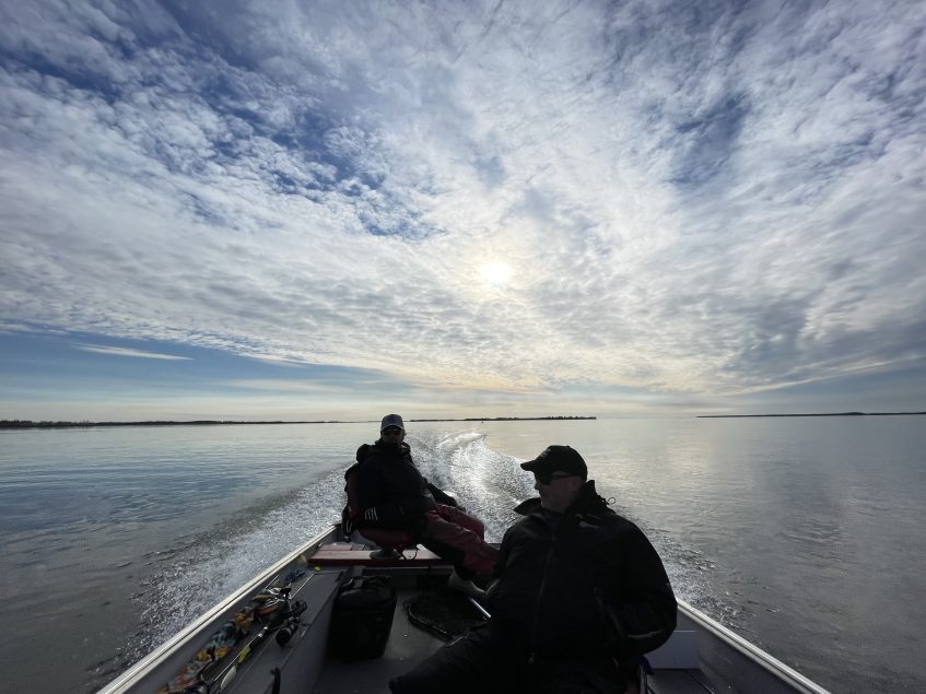 A steady downpour began shortly after we arrived at a beat called “The In Between.” Luca said that we should have good opportunities for both pike and walleyea here. There was a steady current where he “Spot-Locked” the boat 30 yards from shore.