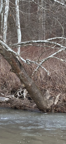 My favorite hole is an undercut, live tree on a stream bend. These holes are not large. The current has eroded the dirt from around the tree roots, creating a cavity that can reach several feet under the tree. Trout love to inhabit this type of hole, and I have been fortunate to catch numerous trout from them. The current brings drifting nymphs to the undercut roots. Trout can easily capture drifting food without having to expose themselves.
