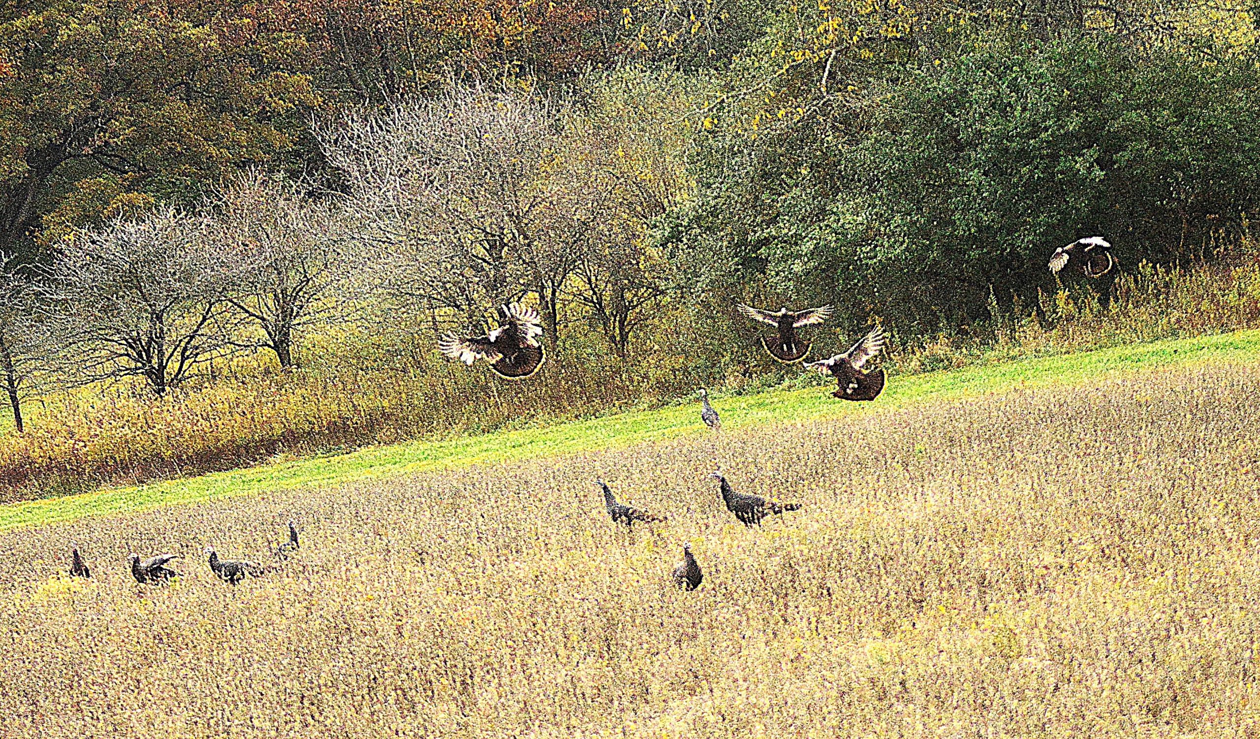 After turkeys fly down from their roosts, their survival instincts aid in their success. Hungry turkeys often go to great lengths to forage on multiple food sources during adverse weather, especially when they feed across sun-drenched hillsides, where green foliage begins growing earlier. But if snow covers the woodland floor, it’s easier to spot turkey tracks and rake-marked scratchings where they search for loose nuts, vegetations, insects and worms. During extreme weather, many foods sources offer turkeys feeding opportunities.