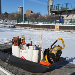 The parking lot and fenced, inside area of the marina are normally off-limits to the general public. They are opened to the public in late winter/early spring after freeze-up for ice fishing. The marina uses pumps to circulate water between the piers, and the slightly warmer, moving water draws baitfish. We found about 6 feet or so of water below the ice. Be careful. The water being circulated leads to thin ice in some spots, as well as “overflow” and soft spots on the ice. I suggest testing the ice with an axe, ice spud or steel pole as you go to make certain that you are standing on good ice. The thickness of the ice even varied from hole-to-hole. I stepped on a spot that looked like snow-covered ice only to have my boot sink down almost a foot into slush.