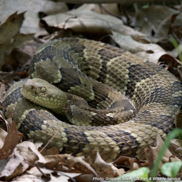 Potentially one of North America’s most dangerous snakes, due to its long fangs, impressive size, and high venom yield, the timber rattlesnake has a relatively mild disposition and long brumation period. It feeds mainly on small mammals, so in areas where it is endangered, conservationists are considering reintroduction programs in order to keep the rodent populations in check.