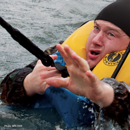 Don’t remove your winter clothing. Heavy clothes won’t drag you down, but instead can trap air to provide warmth and flotation. This is especially true with a snowmobile suit.